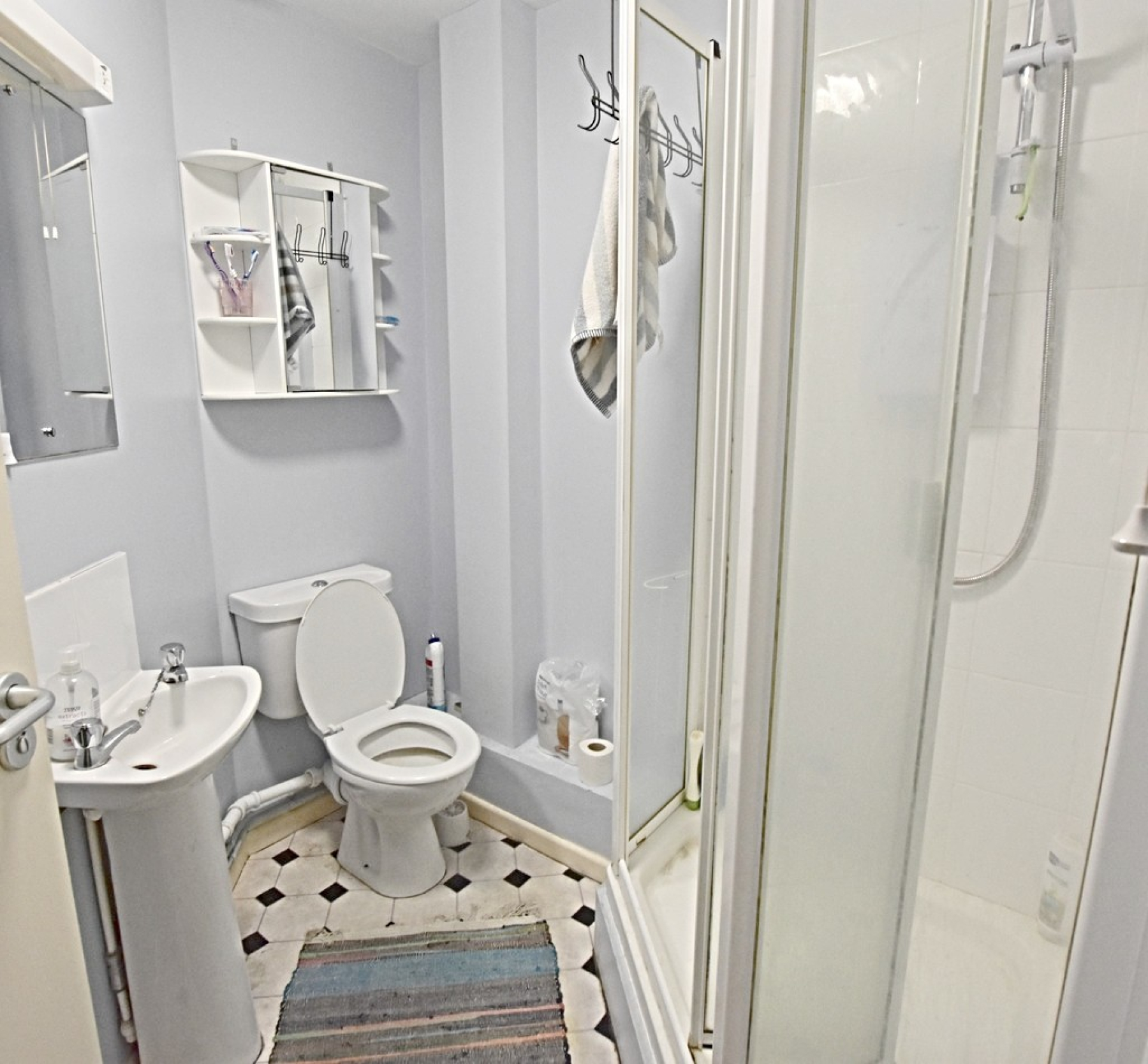 Shower Room 7' 0" x 5' 5" (2.14m x 1.66m) With three-piece white suite comprising of shower cubicle with sliding glass door and electric shower head over, pedestal wash hand basin and low flush W/C, wood effect flooring, radiator, ceiling light point and extractor fan.
