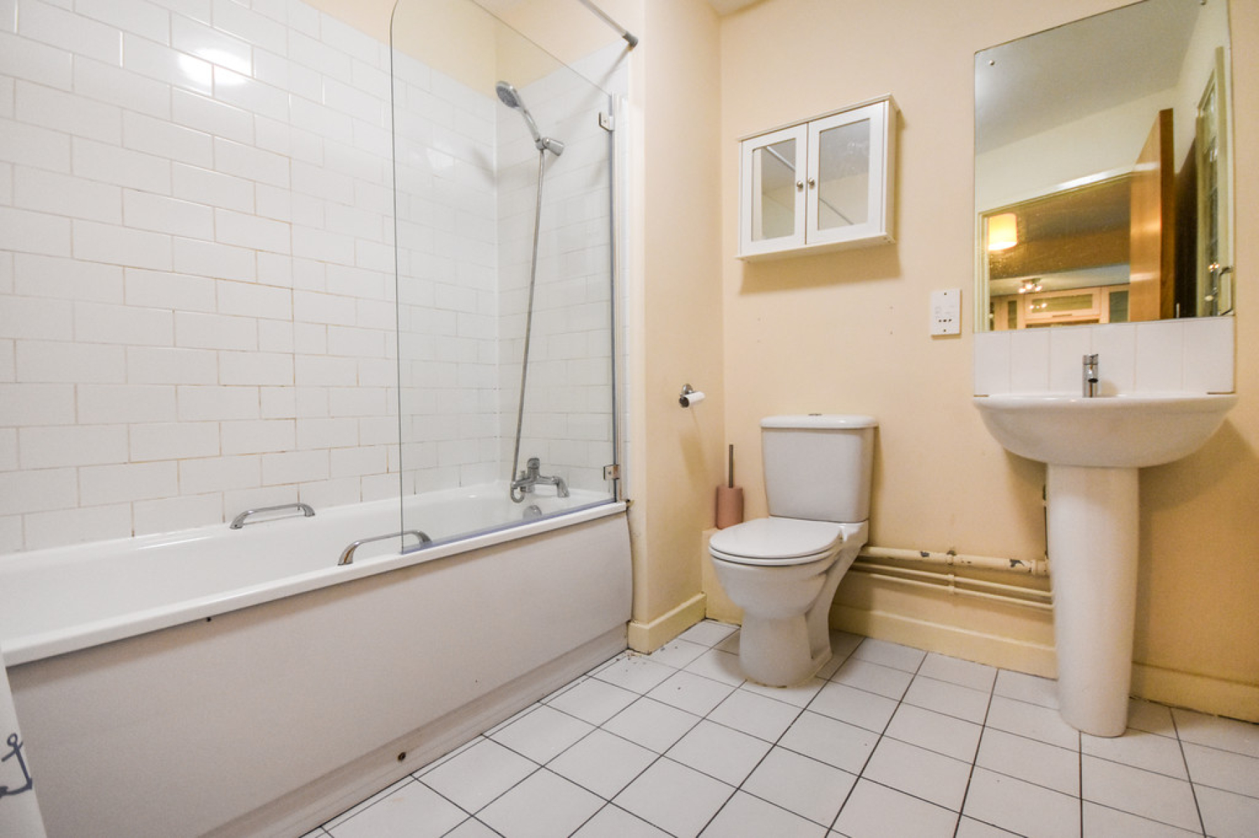 Bathroom7' 8" x 7' 3" (2.34m x 2.21m) Comprising of a white three-piece suite with bath and overhead shower, low level flush W/C, pedestal wash handbasin and heated towel rail.