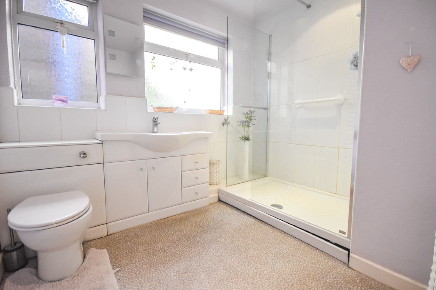 Shower Room 8' 9" x 8' 0" (2.67m x 2.44m) With two obscure double glazed windows to the side elevation, low flush W/C, vanity wash hand basin, walk in double shower enclosure, chrome towel radiator and ceiling light point.