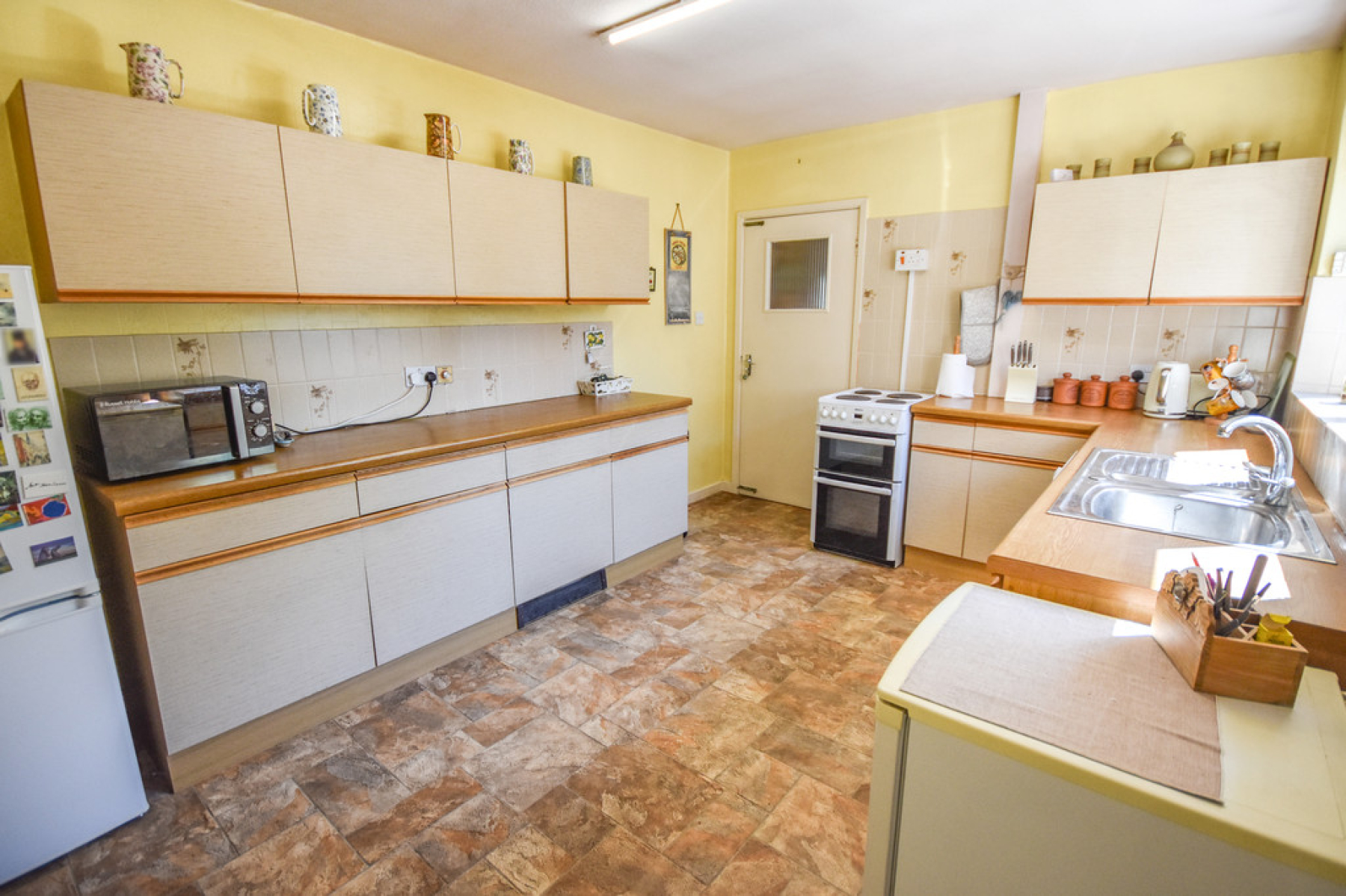 Kitchen 13' 10" x 9' 10" (4.23m x 3.01m) With double glazed window to the side, kick board heater, roll top work surfaces, wall and base units, stainless steel one and a half sink, drainer and mixer tap, space for the cooker, fridge/freezer, and washing machine with doors leading through to the rear porch.