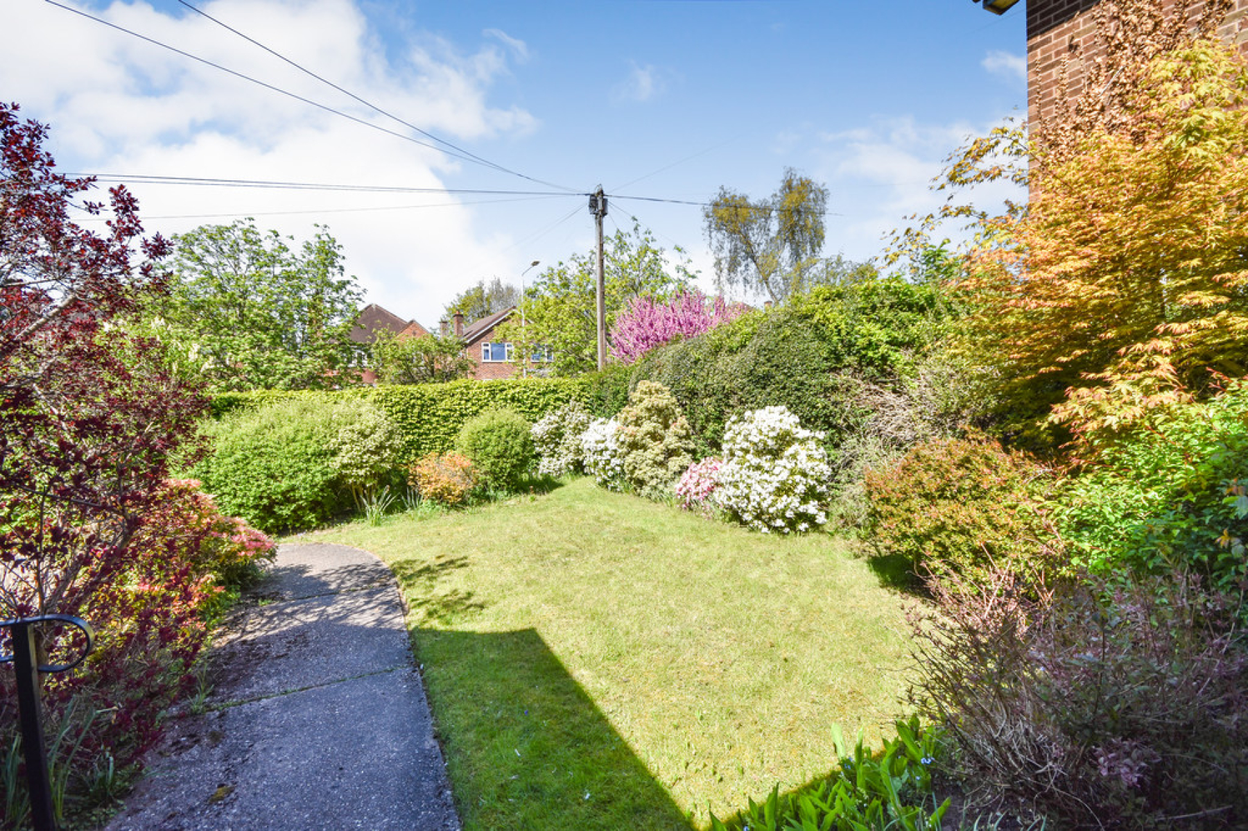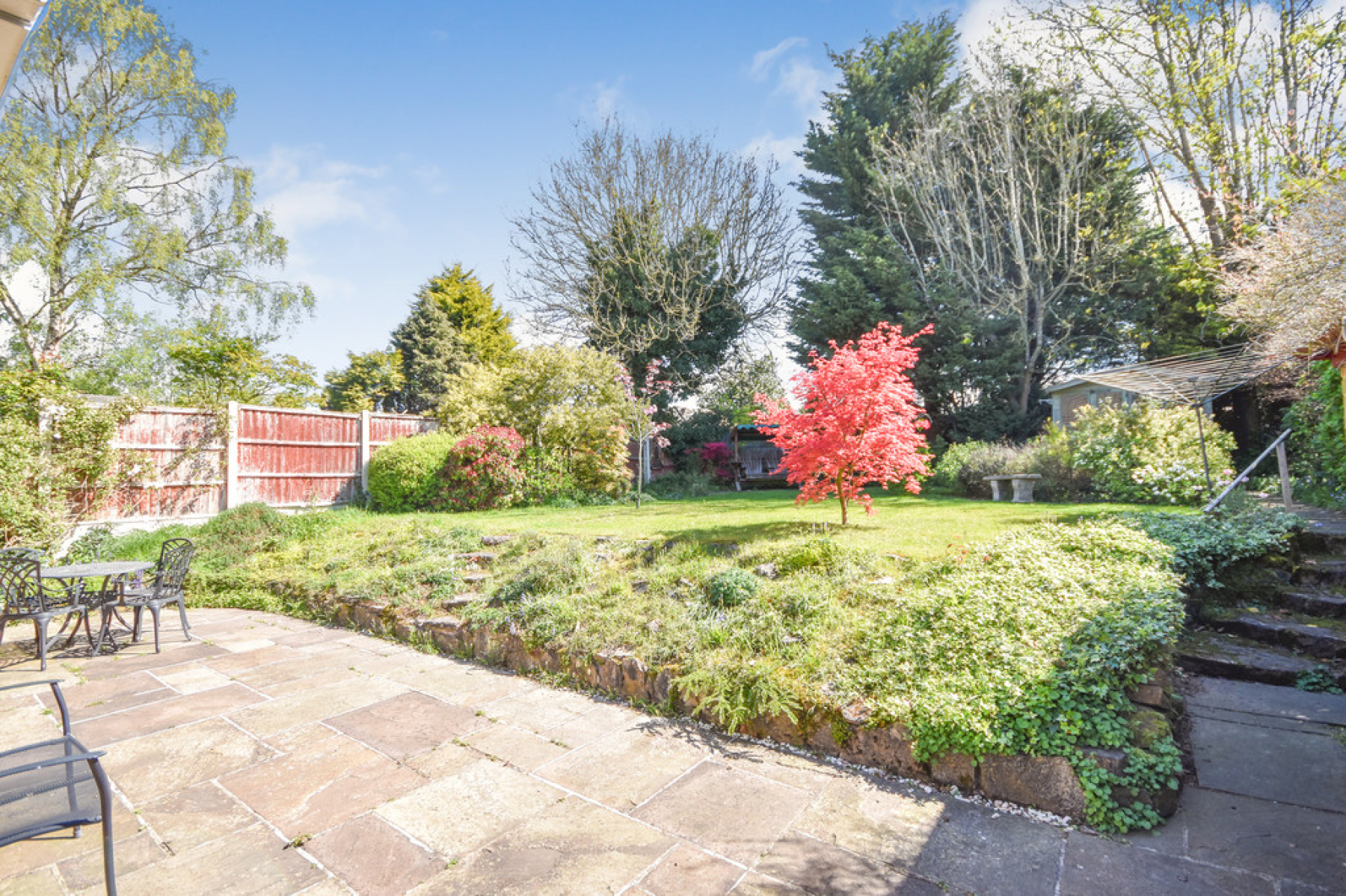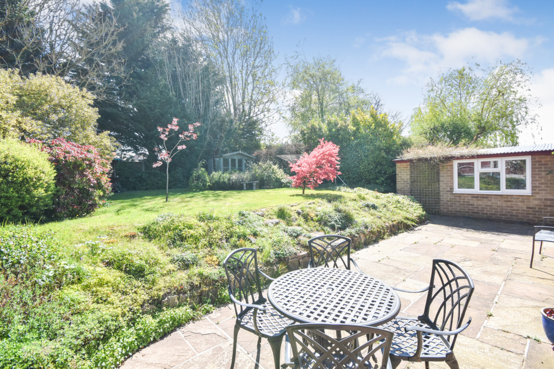 The Rear Garden is a well kept mature garden with lawn, trees, well stocked with shrubs and flower beds, patio, summer house and outside lighting.