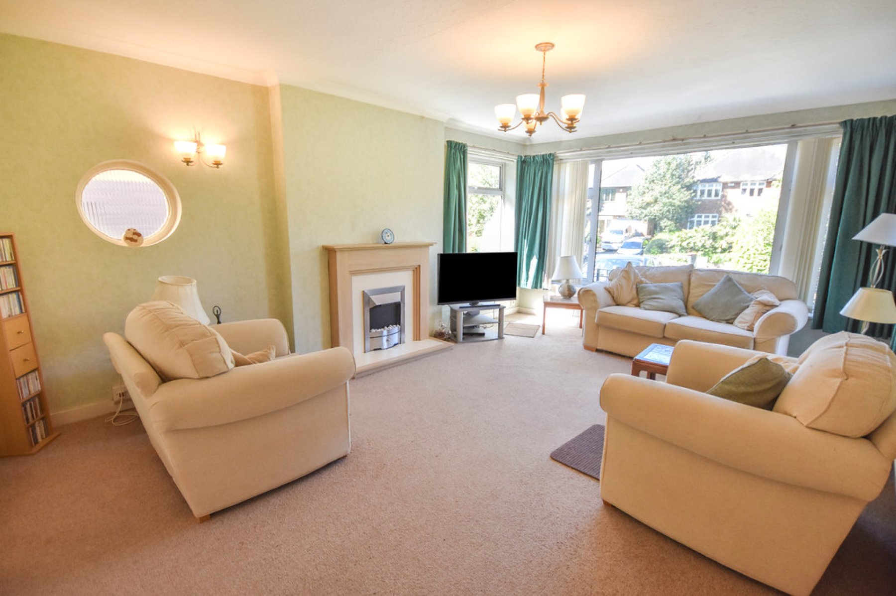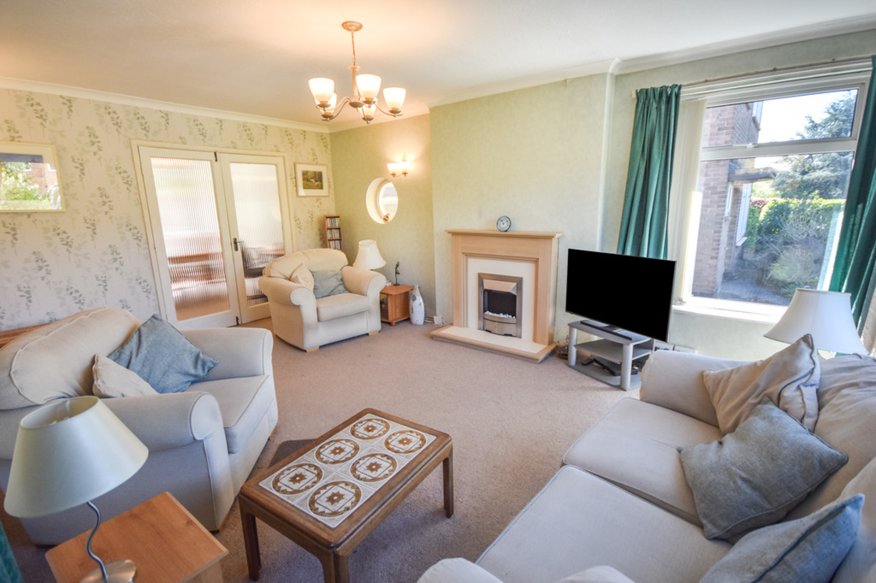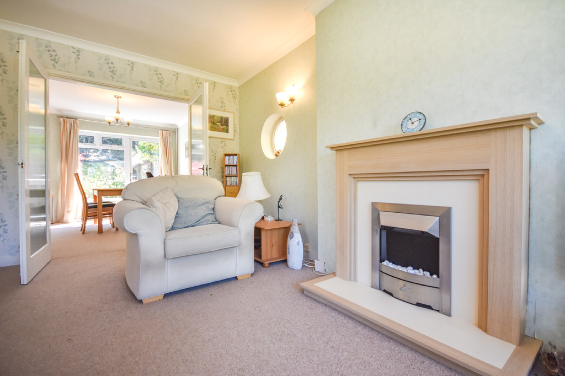 Living Room 17' 11" x 12' 10" (5.47m x 3.92m) With double glazed windows to front and side elevations, port hole style window to the side, radiator, feature fireplace with electric fire, ceiling light point and double doors leading through to the dining room.