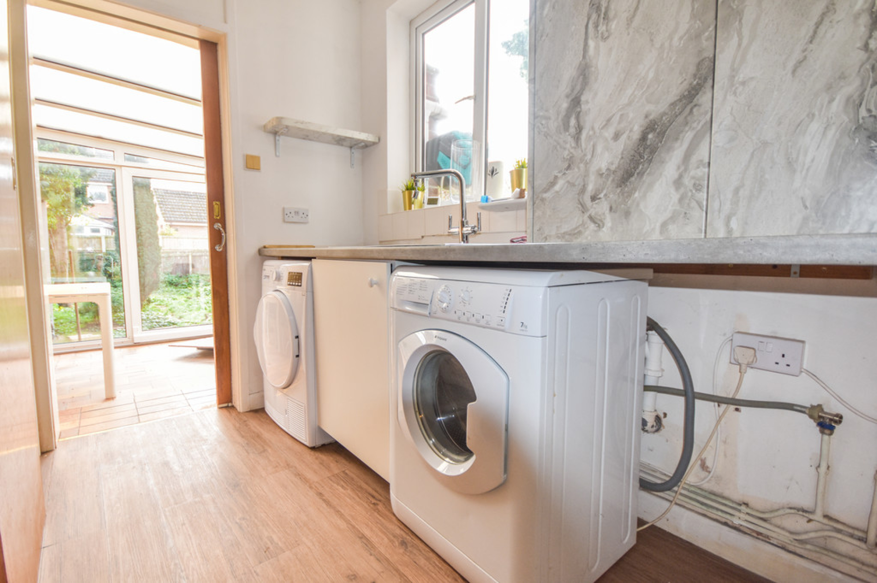 Utility Room 20' 7" x 8' 2" (6.29m x 2.51m) With UPVC double glazed window to the side elevation, stainless steel sink and drainer with mixer tap over, plumbing for washing machine and space for dryer and dishwasher, cupboard enclosing the Valliant Combination Boiler, sliding door leading to the low flush W/C, two ceiling light points and continuation of laminate flooring with further doors leading to both the garage and conservatory.