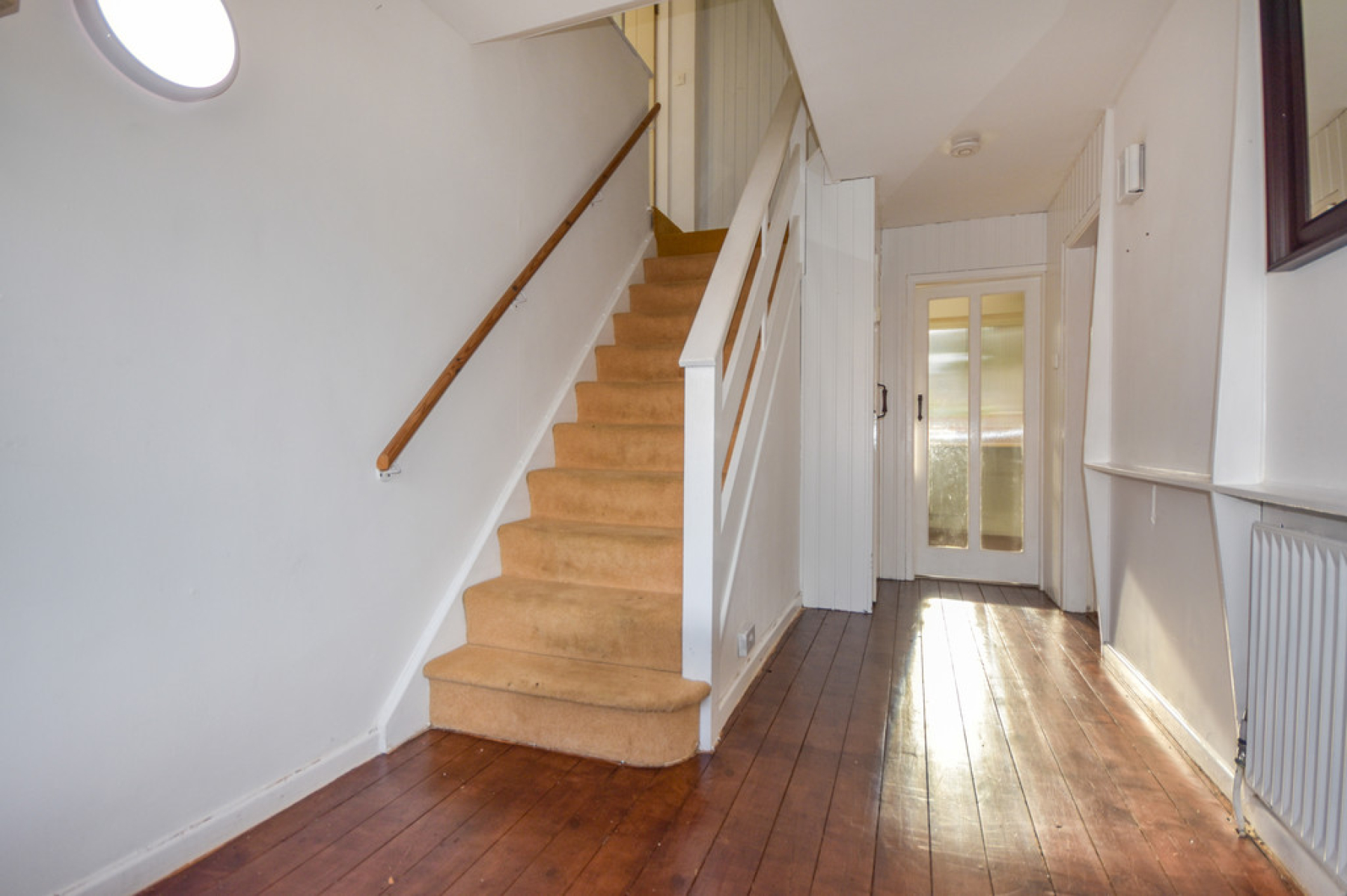 Entrance Hallway Entry through the front entrance door with stairs rising to the first floor, radiator, wall mounted light point, wood flooring under stairs storage cupboard and doors leading through to the kitchen and living room.