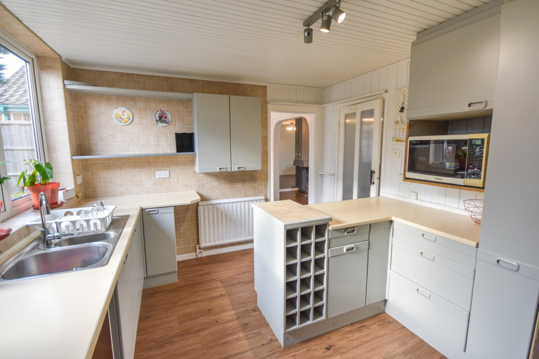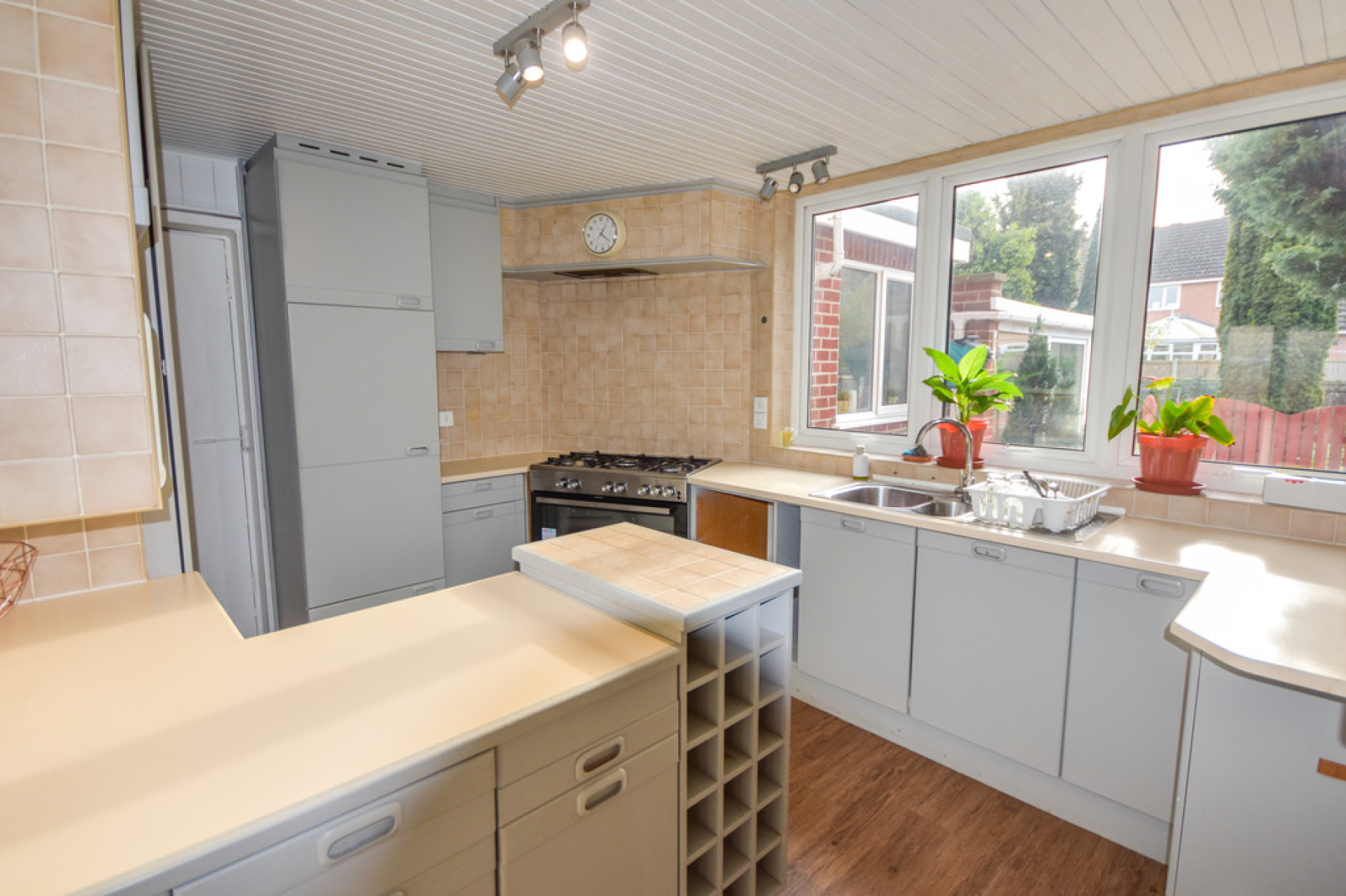 Kitchen 12' 7" x 10' 4" (3.85m x 3.17m) With UPVC double glazed window to the rear elevation, range of wall and base units with roll edge work surfaces, stainless steel sink and drainer with mixer tap over, integrated fridge, electric oven with five ring gas hob, tiled splash backs, ceiling light point, laminate flooring and door leading out to the utility room.