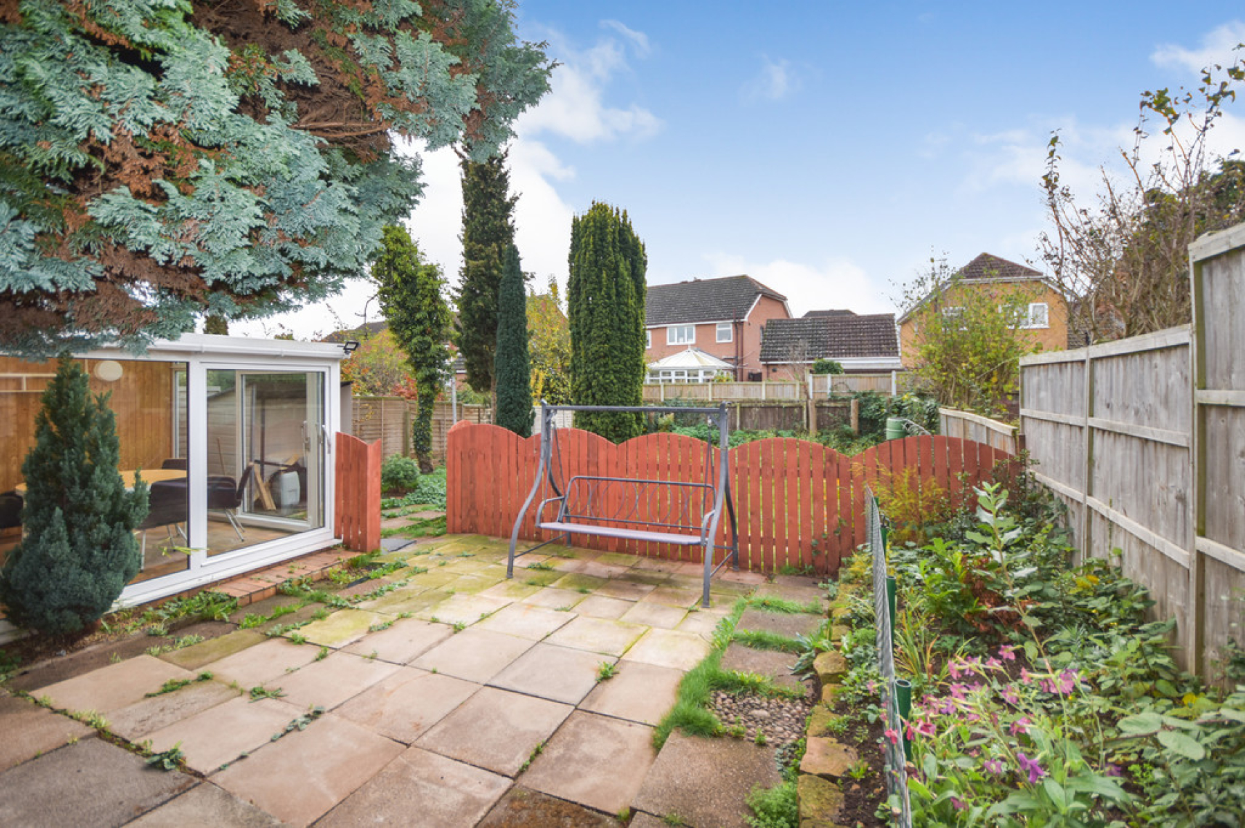 The rear garden is mainly laid to lawn with a large patio area off the dining room and conservatory with fenced borders.