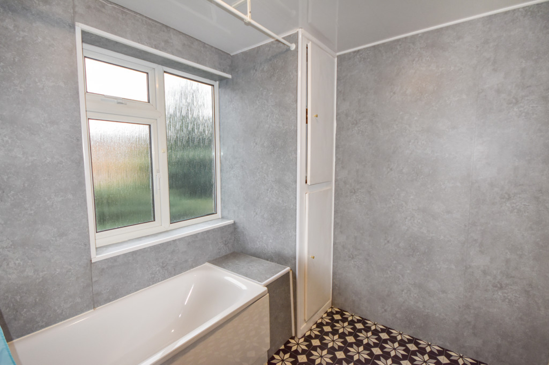 Bathroom 8' 9" x 7' 3" (2.69m x 2.22m) With obscure UPVC double glazed window to the rear elevation, two piece suite comprising of paneled bath with mains fed shower head over, vanity unit wash hand basin, aqua boarded walls, tiled effect flooring, radiator, ceiling light point and storage cupboard.