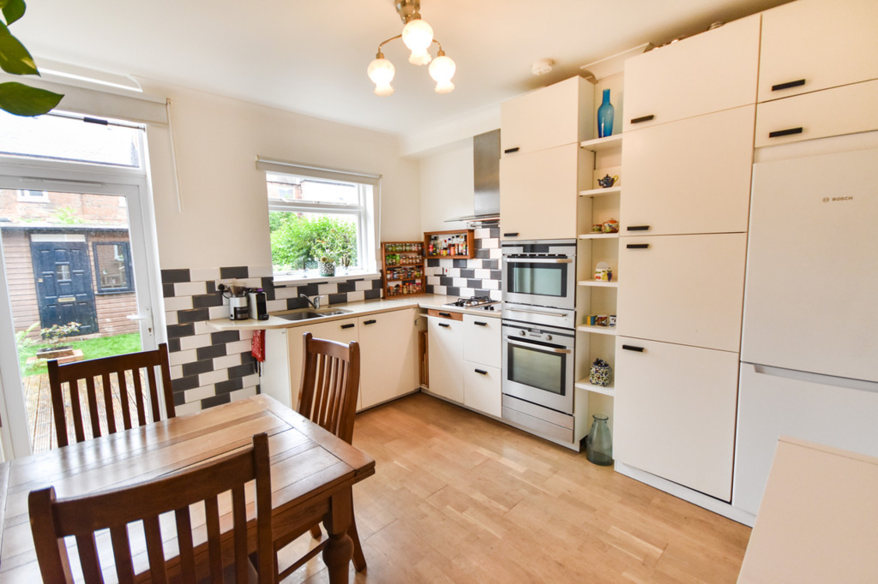 Kitchen/Diner 12' 2" x 11' 10" (3.71m x 3.61m) With UPVC double glazed window to the rear elevation, radiator, ceiling light point, oak wood flooring, range of wall and base units with sharp edge granite effect work surfaces, stainless steel sink and drainer with mixer tap over, integrated electric oven, microwave, space for large fridge/freezer, two ring electric hob and two ring gas hob with extractor fan over, tiled splash backs, doors leading to under stairs shower room, living room entrance hallway and rear garden.