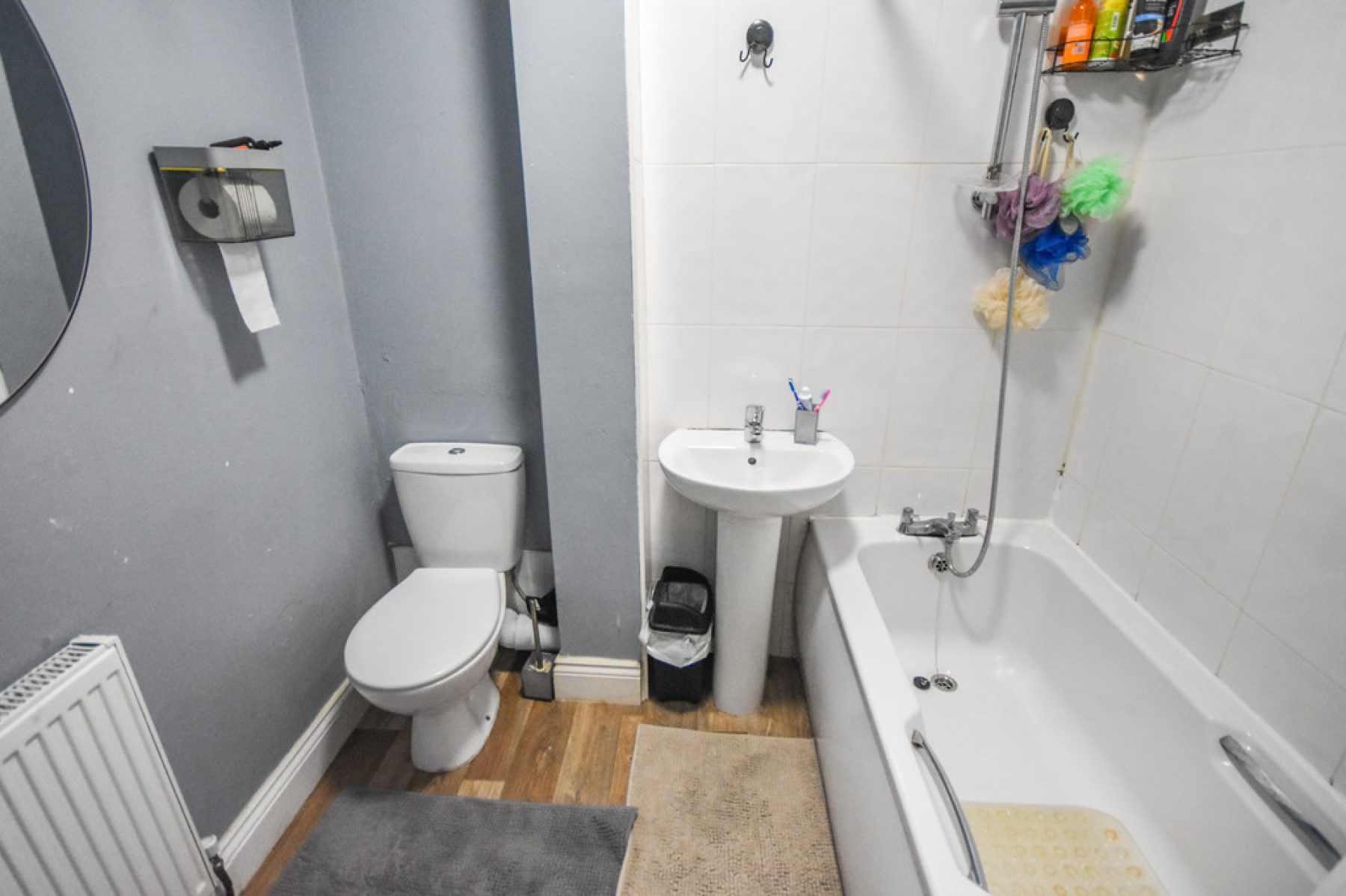 Bathroom 7' 3" x 6' 7" (2.21m x 2.03m) With white three-piece suite comprising of paneled bath with mains fed shower head over, pedestal wash hand basin, part tiled walls, low flush W/C, wood effect flooring, radiator, extractor fan and ceiling light point.