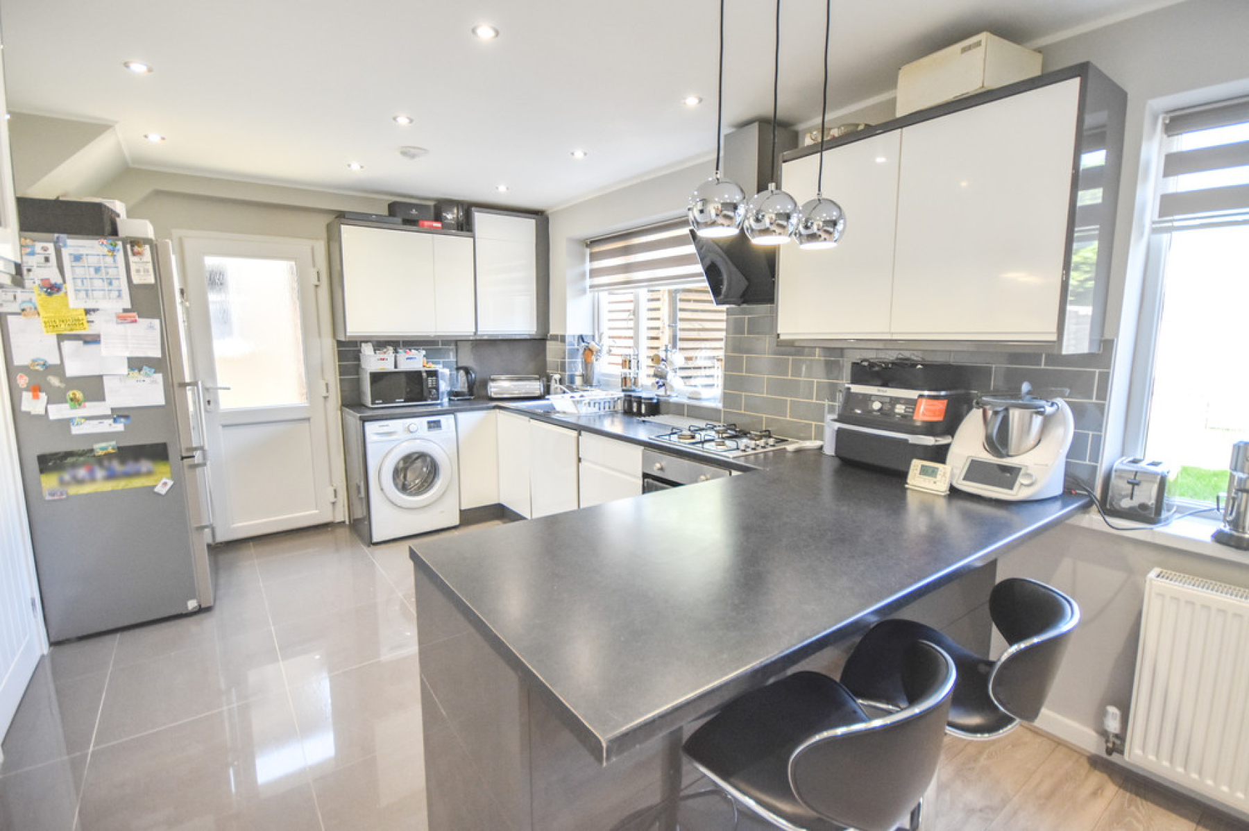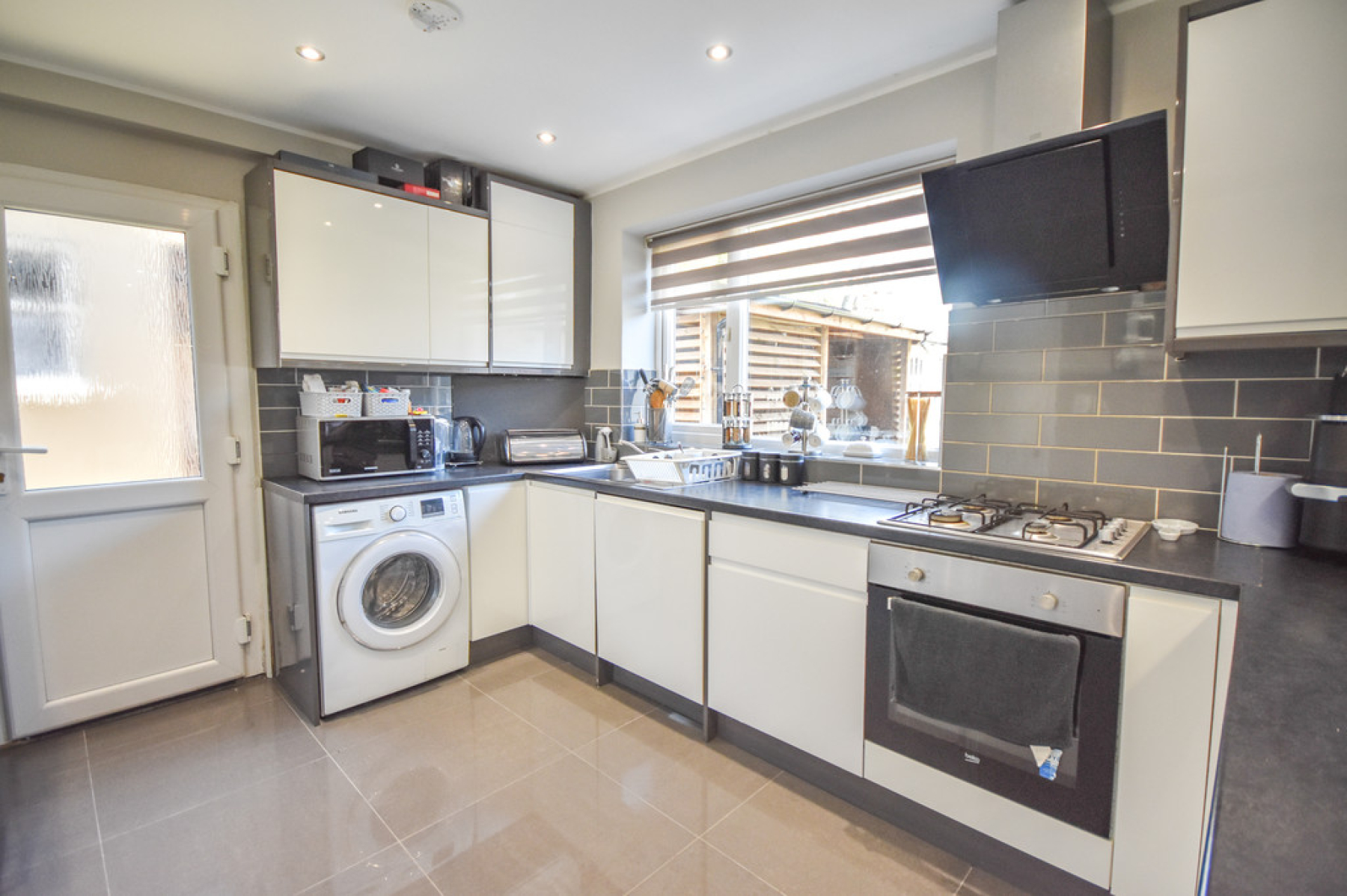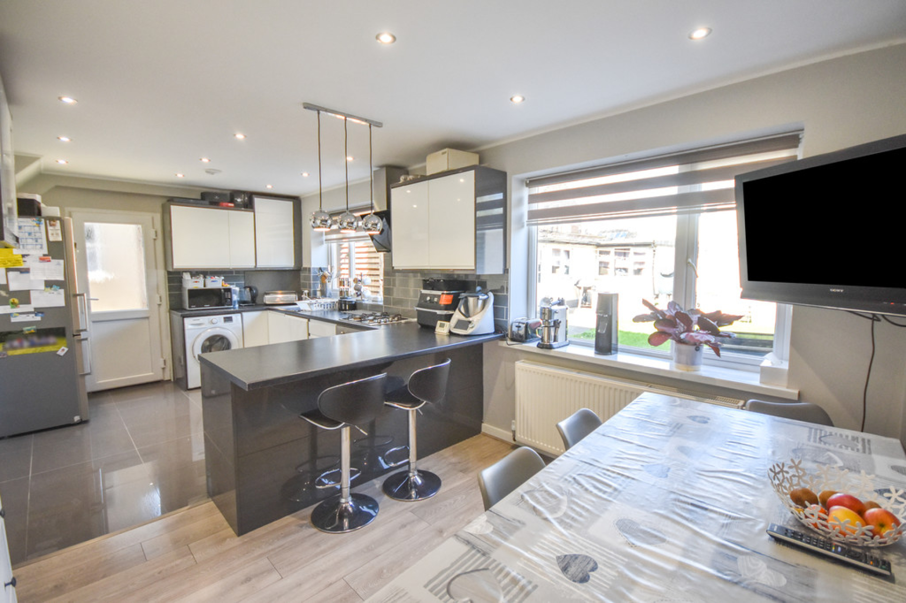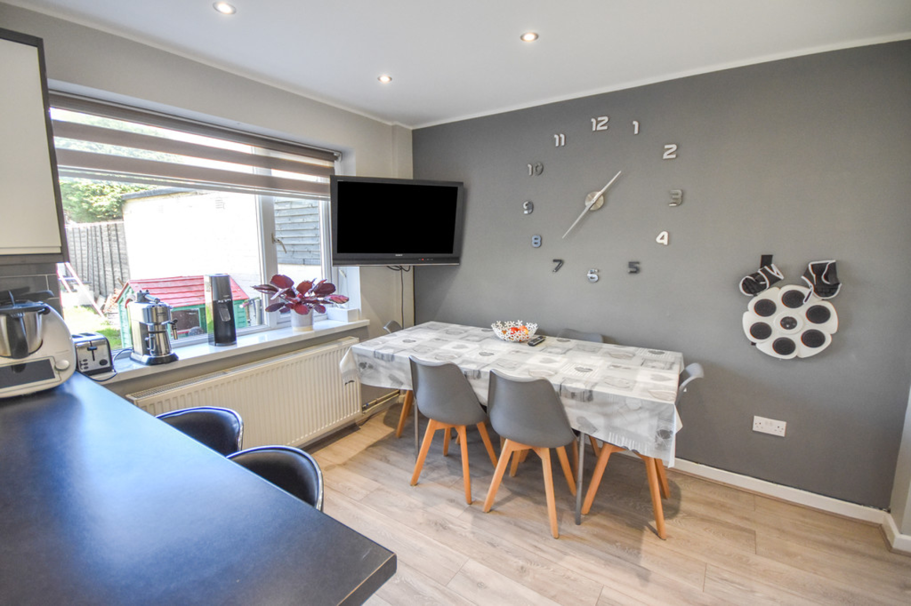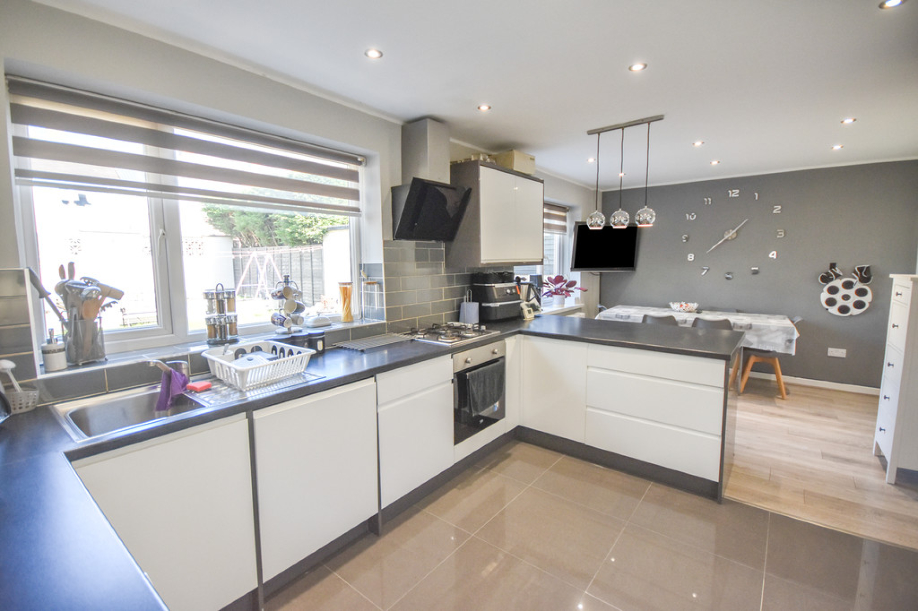 Kitchen Diner 20' 9" x 10' 11" (6.35m x 3.35m) With UPVC double glazed windows to the rear elevation, range of wall and base units with granite effect roll edge work surfaces, stainless steel sink and drainer with mixer tap over, plumbing for washing machine, integrated dishwasher, electric oven with four ring gas hob, part tiled walls with splash back and extractor hood over, space for fridge freezer, ceiling spotlights, tiled flooring in the kitchen area and LVT flooring in the dining space, double radiator, cupboard housing the Ideal combination boiler and door leading out to the side access.
