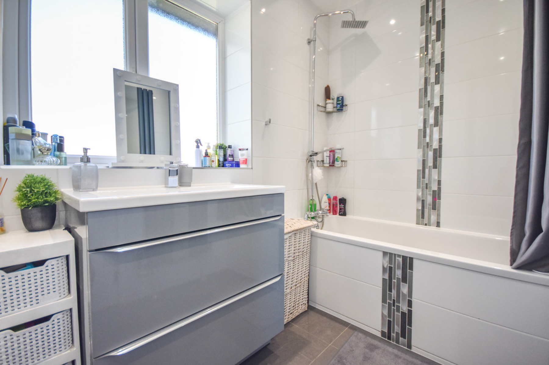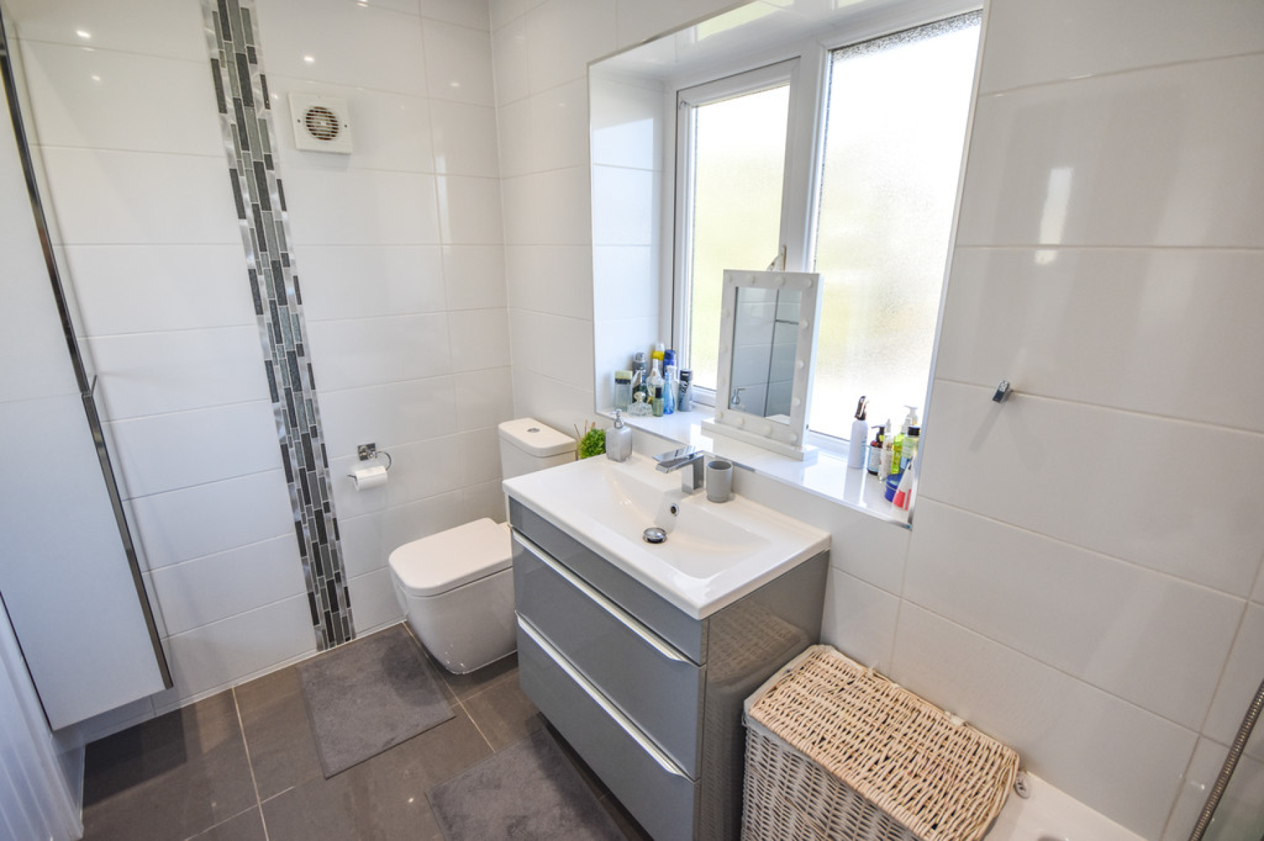 Bathroom 8' 11" x 6' 10" (2.72m x 2.10m) With obscure UPVC double glazed window to the rear elevation, three piece suite comprising of tiled bath with mains fed rainfall shower head over, vanity wash hand basin, low flush W/C, tiled walls, tiled flooring, chrome towel radiator, extractor fan and ceiling spot lights.