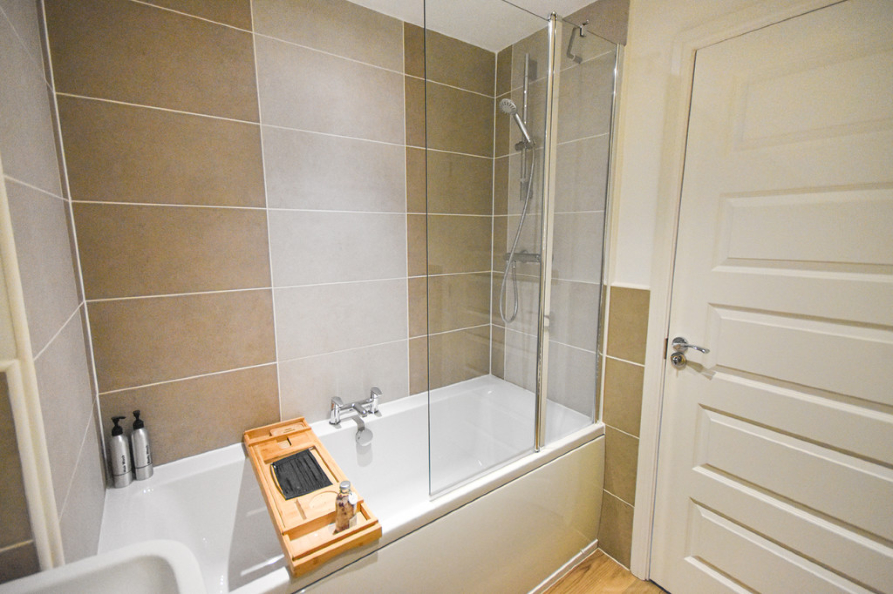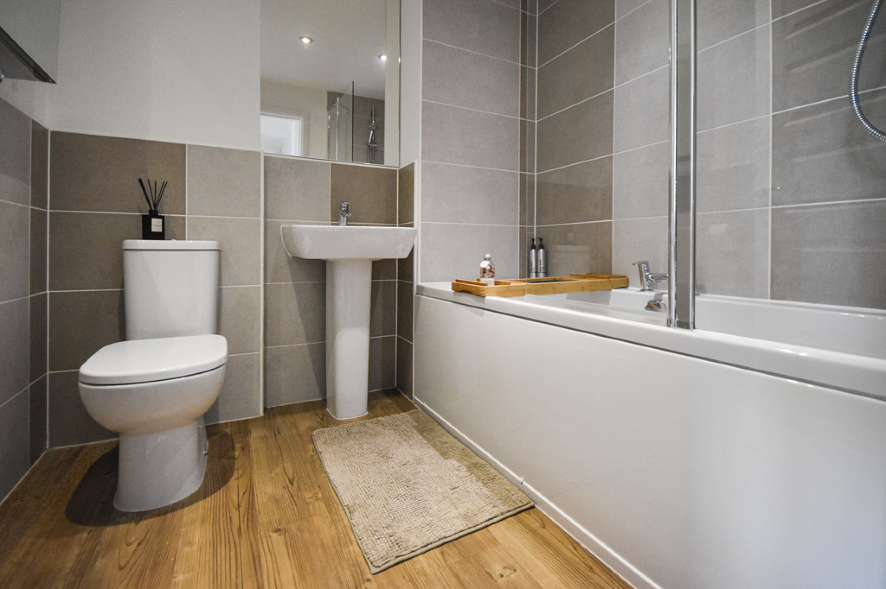 Bathroom 7' 0" x 6' 2" (2.14m x 1.88m) With three piece suite comprising of paneled bath with mains fed shower head over, pedestal wash hand basin, low flush W/C, upgraded tiled walls, LVT flooring, chrome towel, radiator, ceiling spot lights and extractor fan.