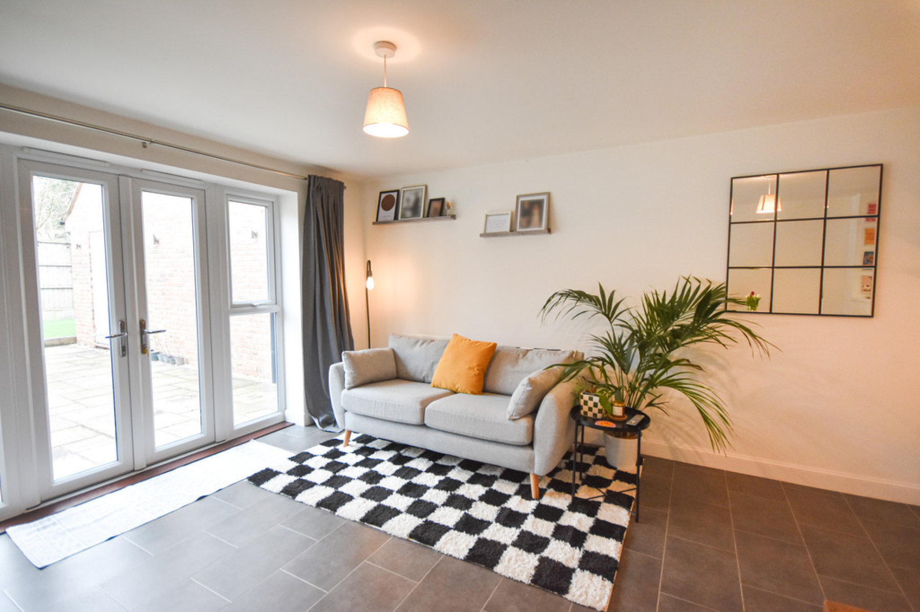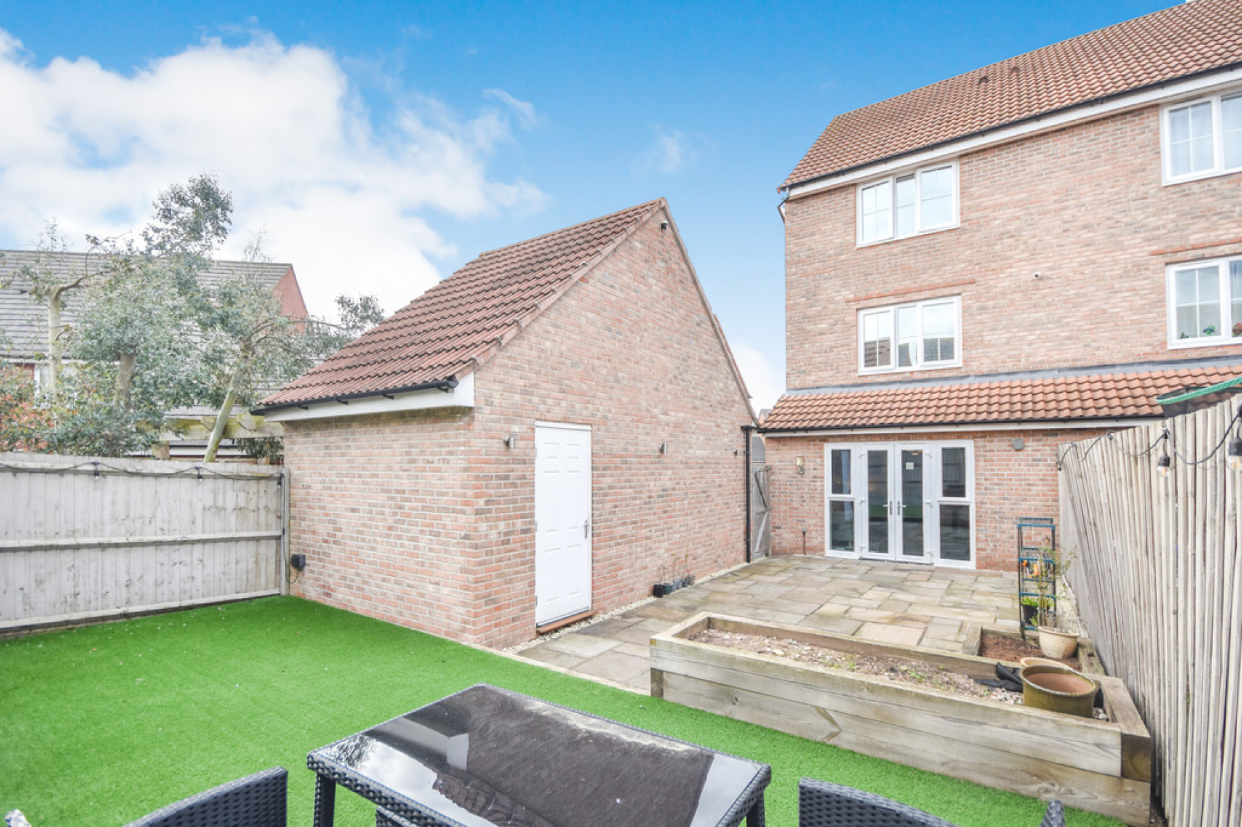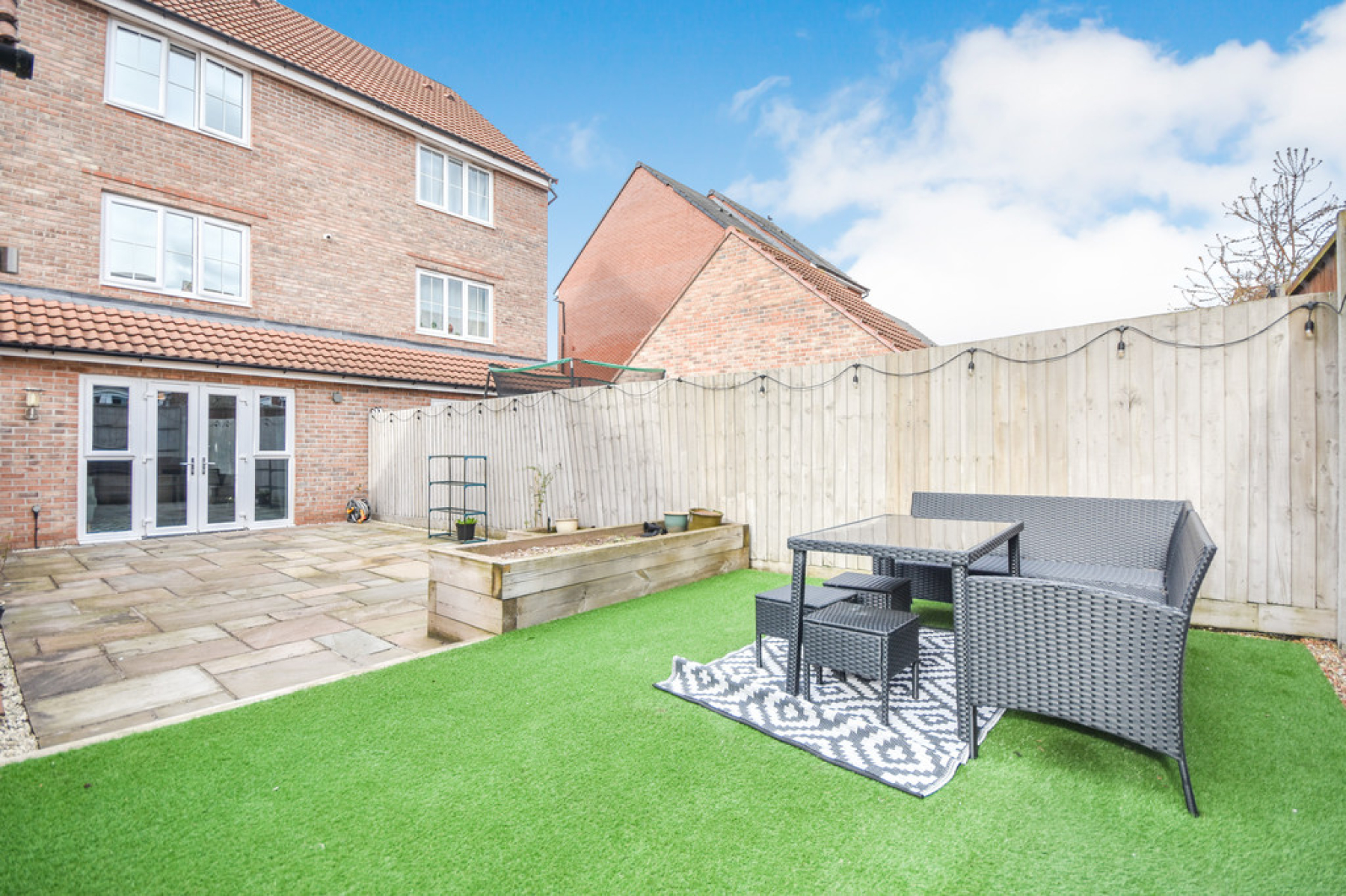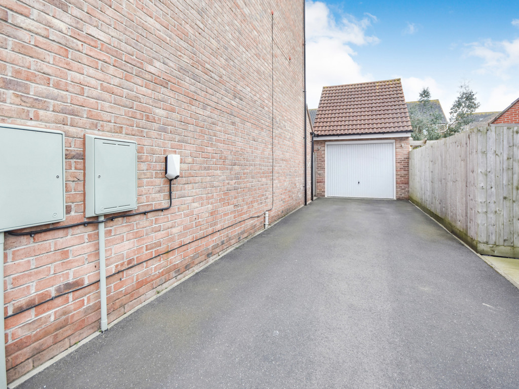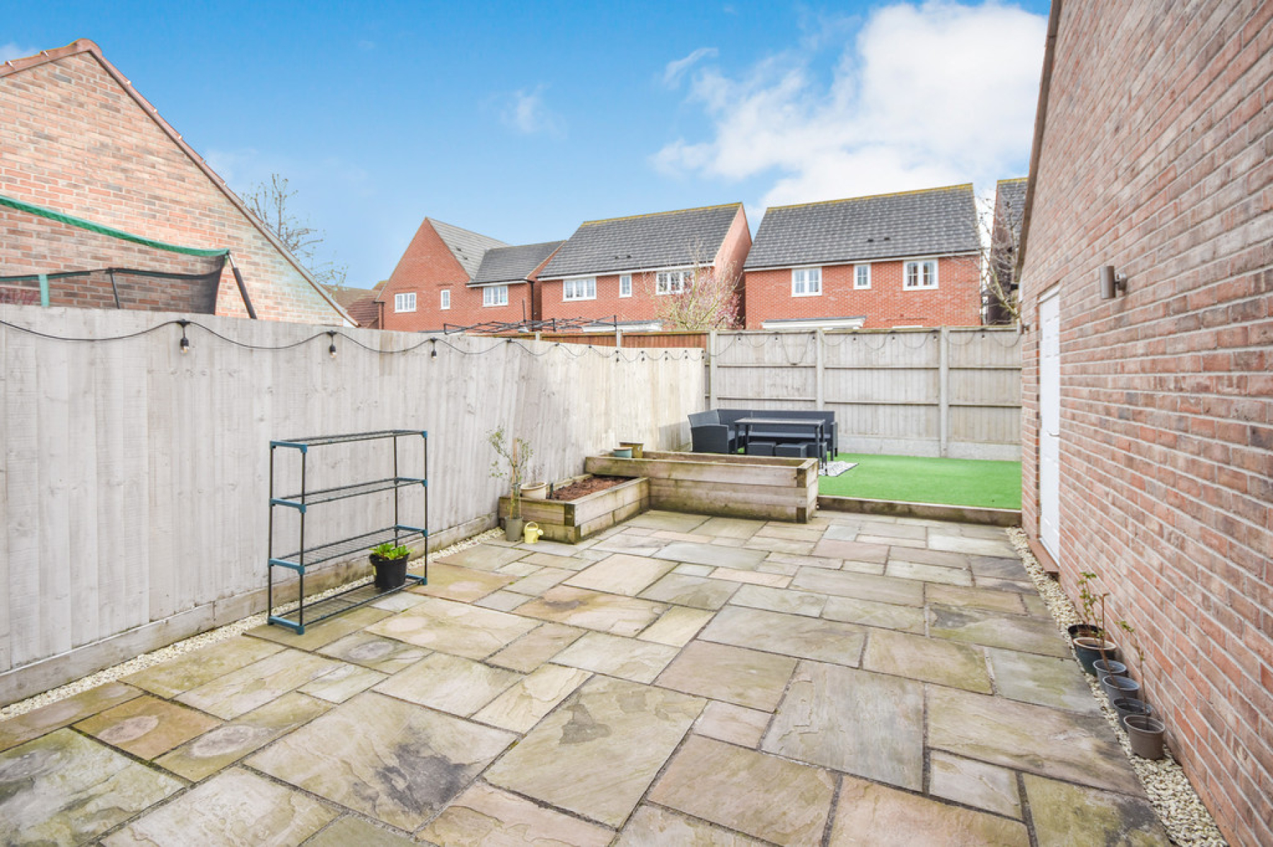 Outside To the front of the property is a large tandem driveway providing off road parking for at least three cars, with EV charger which in turn leads to garage. The low maintenance rear garden is mainly laid to sandstone patio with a raised artificial grass area at the very rear spanning the full width of the property, the rear garden also benefits from outdoor socket and separate door leading into the garage with fenced borders.