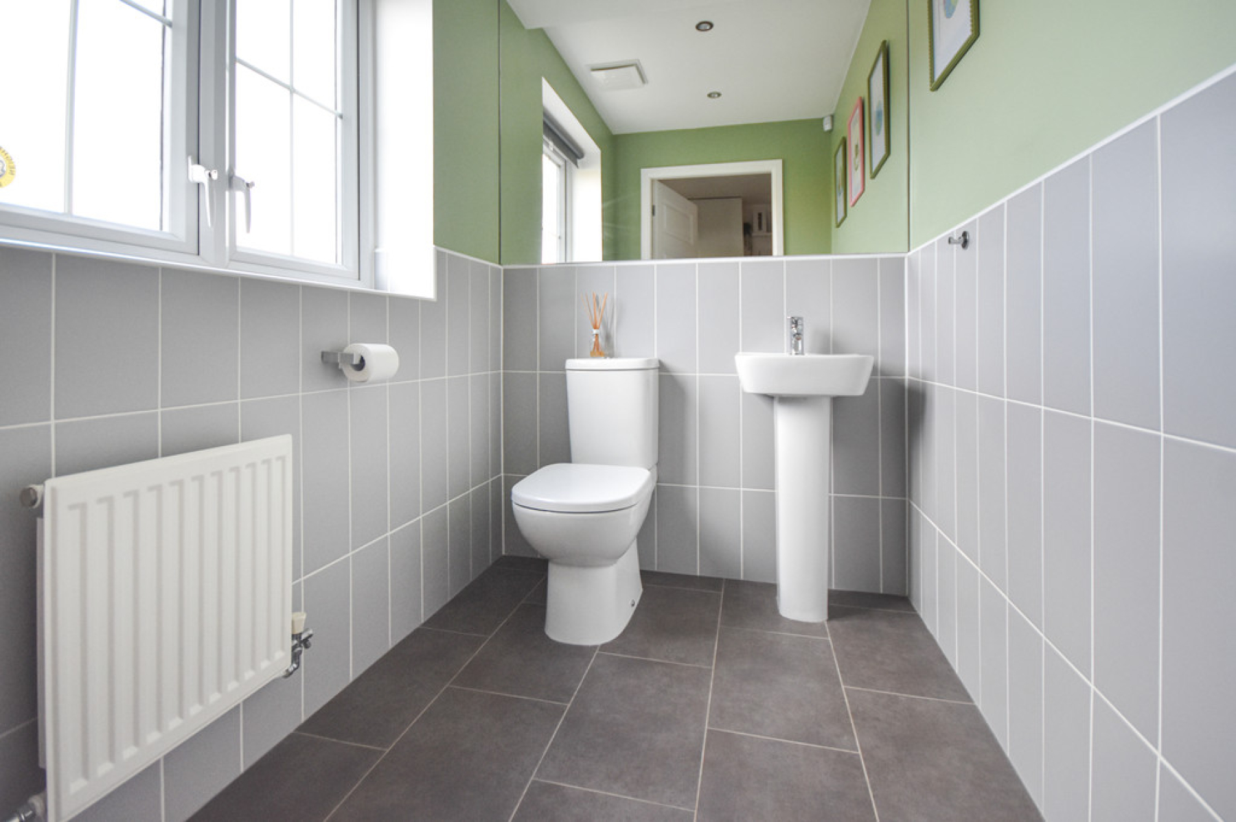 Downstairs W/C With UPVC double glazed window to the front elevation, pedestal wash hand basin, low flush W/C, upgraded tiled walls, Amtico flooring, radiator, ceiling spot lights and extractor fan.