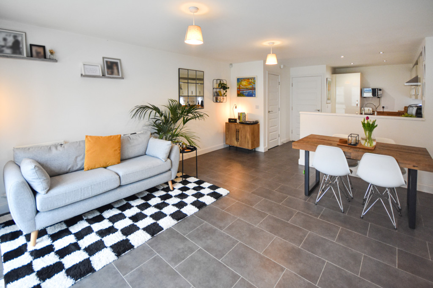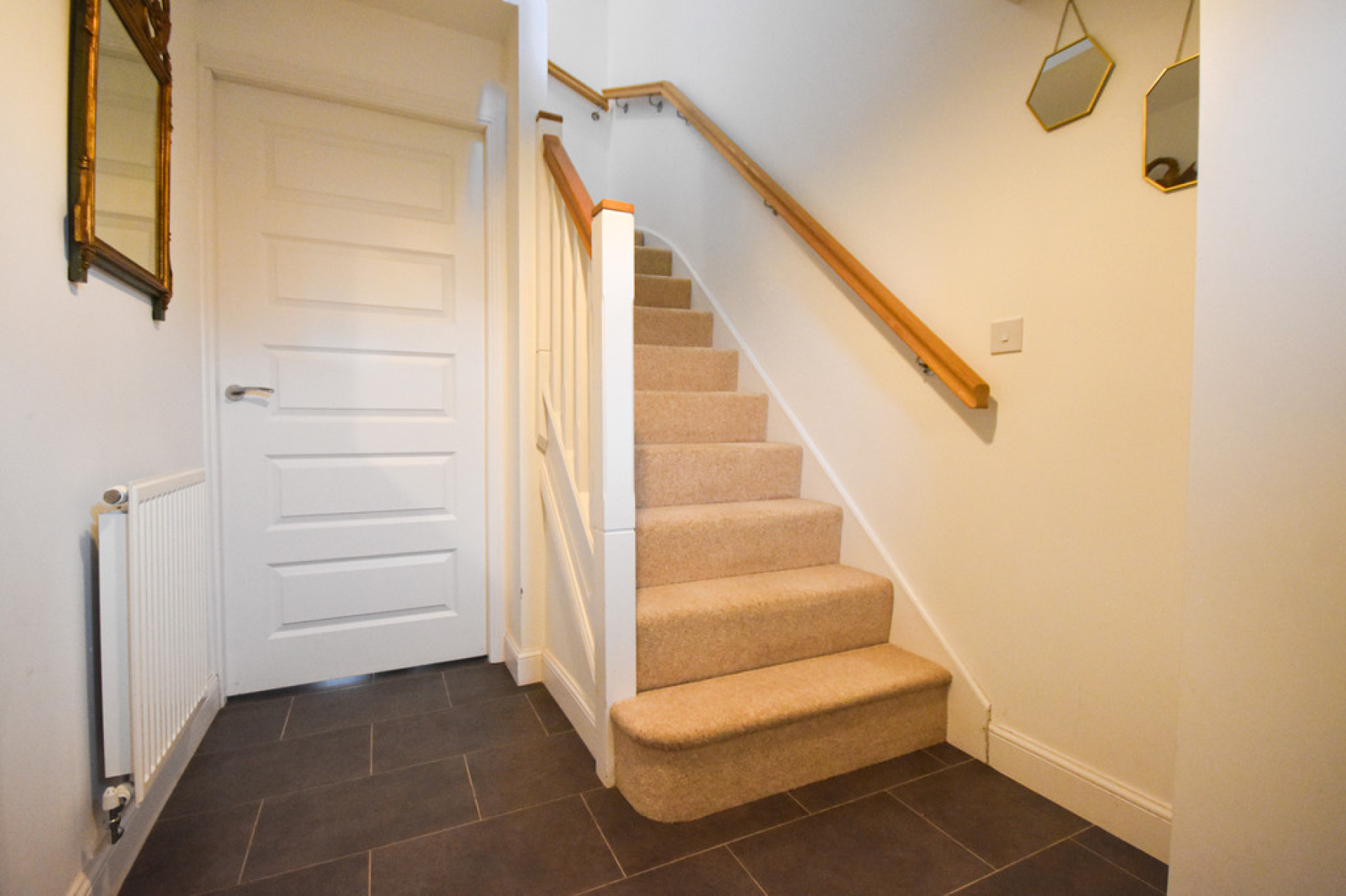 Entrance Hallway Entry through the front entrance door with stairs rising to the first floor, fitted storage cupboard, radiator, ceiling light point and doors leading to the Living/Dining Kitchen and Downstairs W/C.