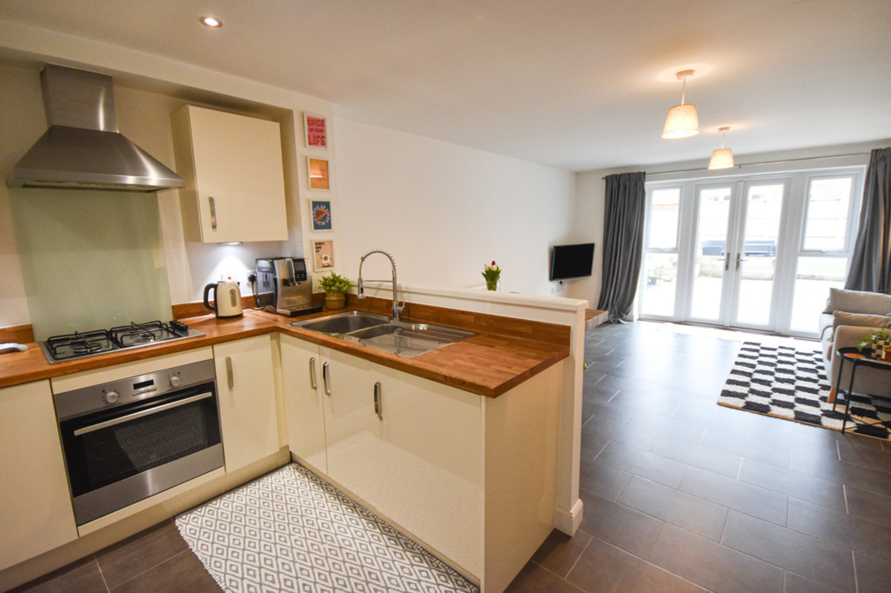 Living/Dining Kitchen 26' 6" x 13' 7" (8.09m x 4.15m) With UPVC double glazed window to the rear elevation, range of wall and base units with wood effect roll edge work surfaces, stainless steel sink and drainer with mixer hose tap over, integrated Electrolux washing machine and dishwasher, electric oven and four ring gas hob with glass splash back and extractor hood over, integrated 50/50 fridge and freezer, under stairs storage cupboard, ceiling spot lights, Amtico tiled flooring, two radiator and French doors leading out to the rear garden.