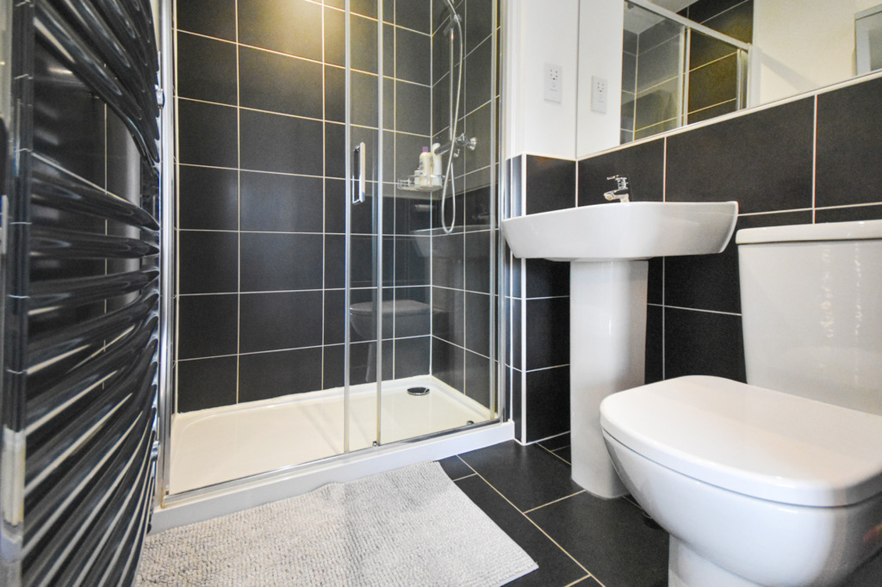 En-Suite 6' 2" x 4' 8" (1.89m x 1.43m) With three piece suite comprising of double tray shower cubicle with mains fed waterfall shower head over as well as hand held shower head, pedestal wash hand basin, low flush W/C, upgraded black tiled walls, black tiled flooring, chrome towel radiator, ceiling spot lights and extractor fan.