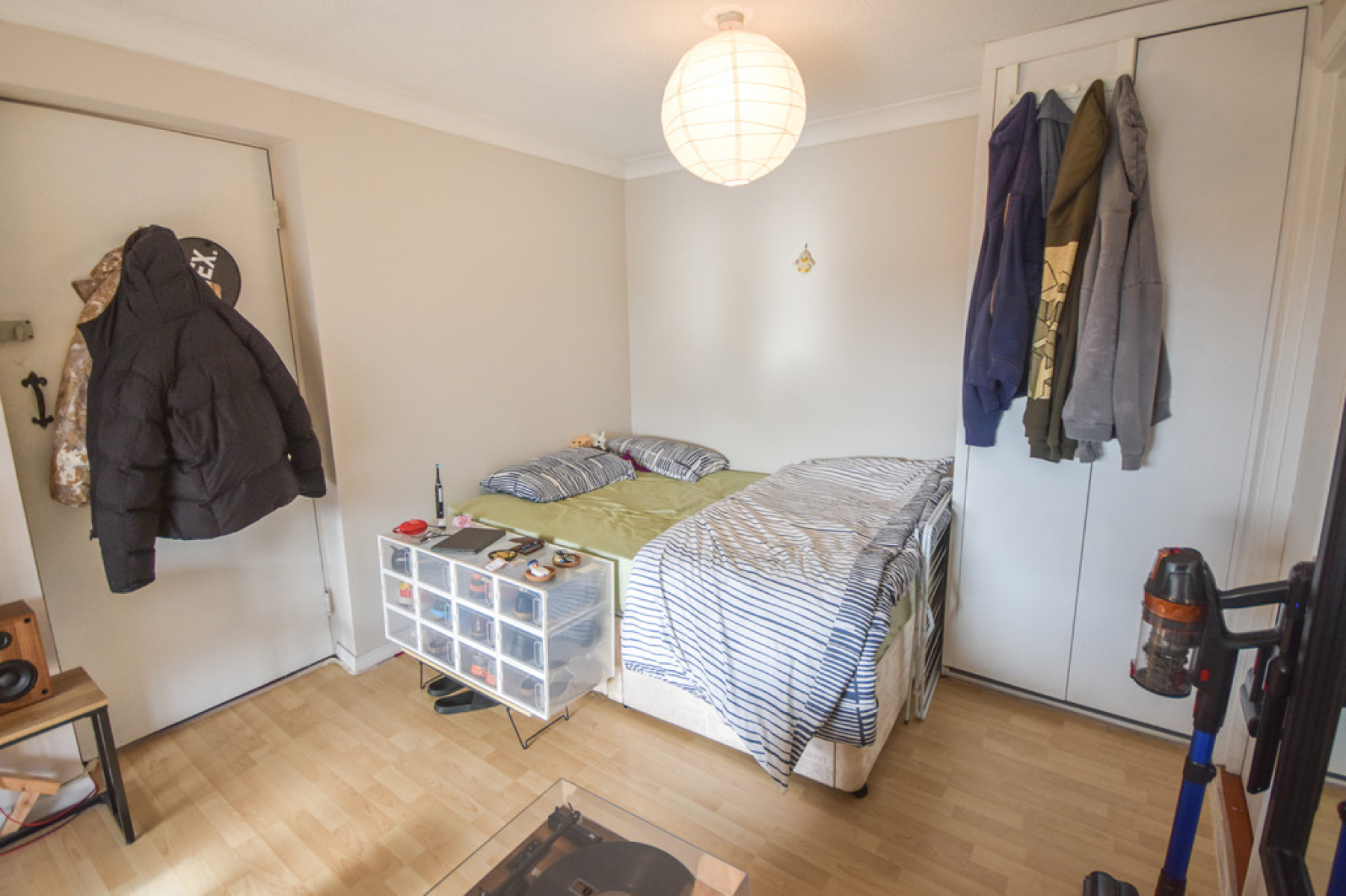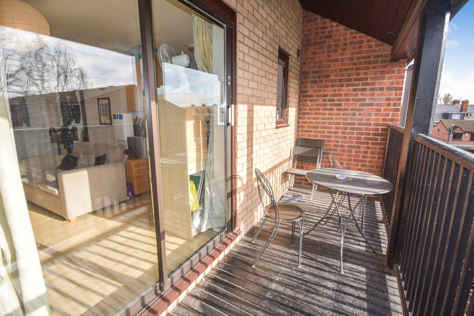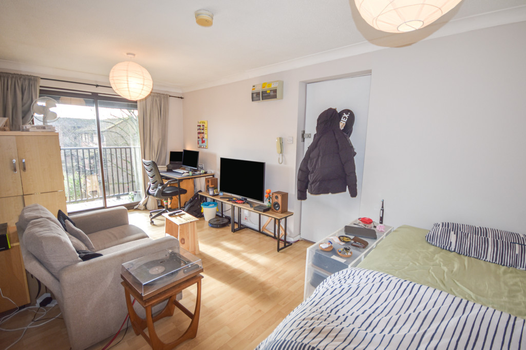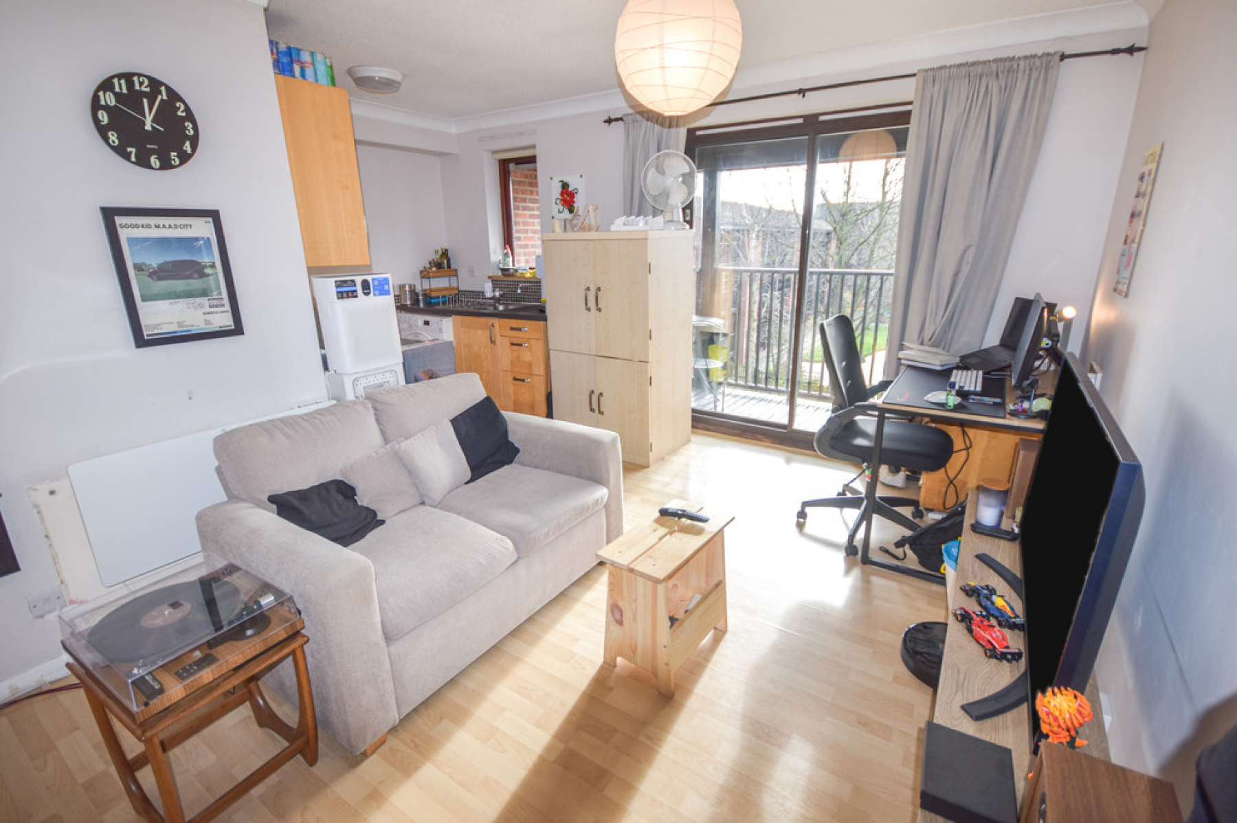 Living/BedroomArea18' 10" x 9' 10" (5.75m x 3.00m) Entrance from the communal hallway with bedroom area to the left and living area to the right. With double glazed sliding patio door to the front elevation leading out to the balcony, electric storage heater, laminate flooring, fitted wardrobe, two ceiling light points, door leading through to the bathroom and open plan to the kitchen area.