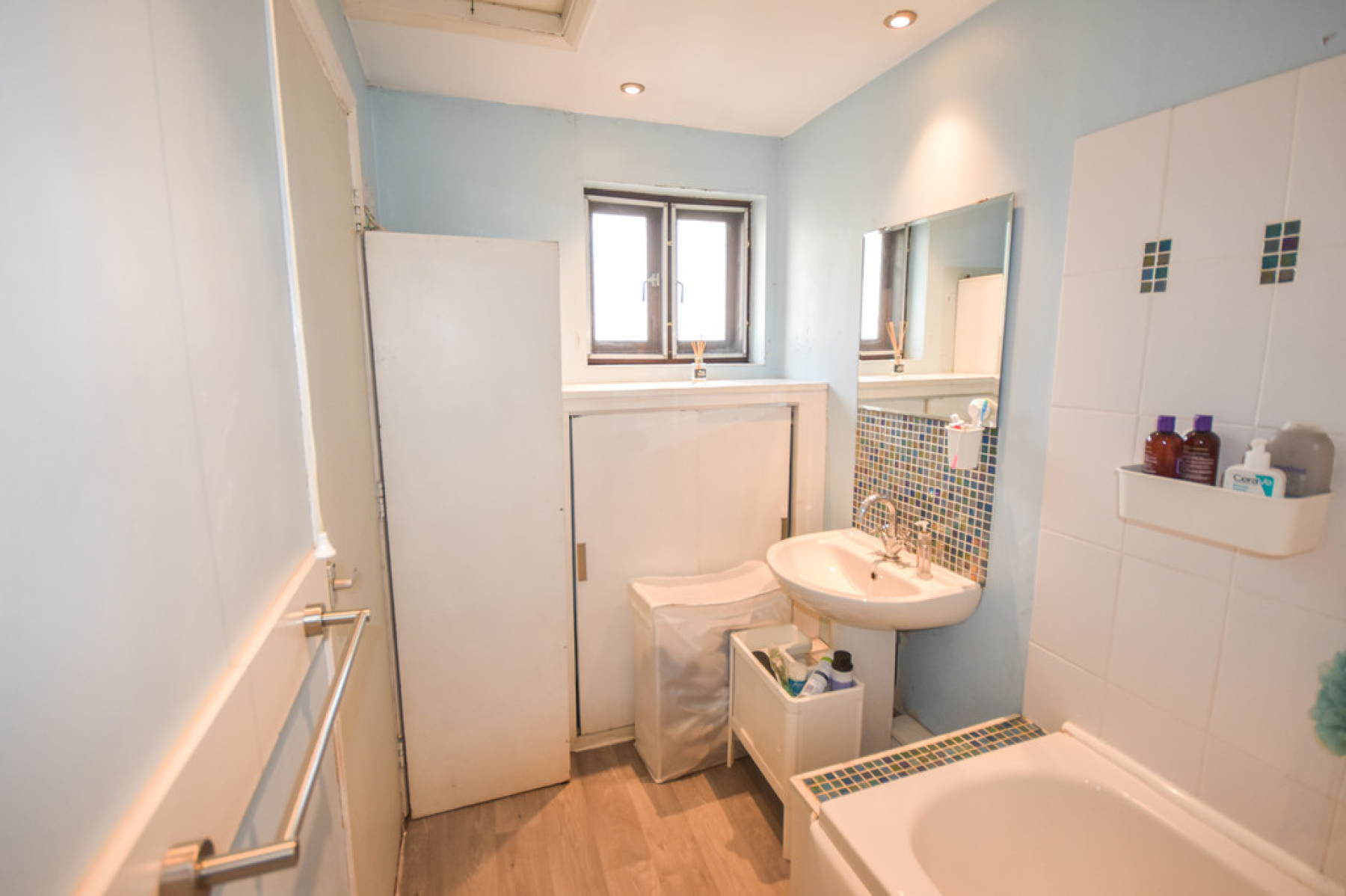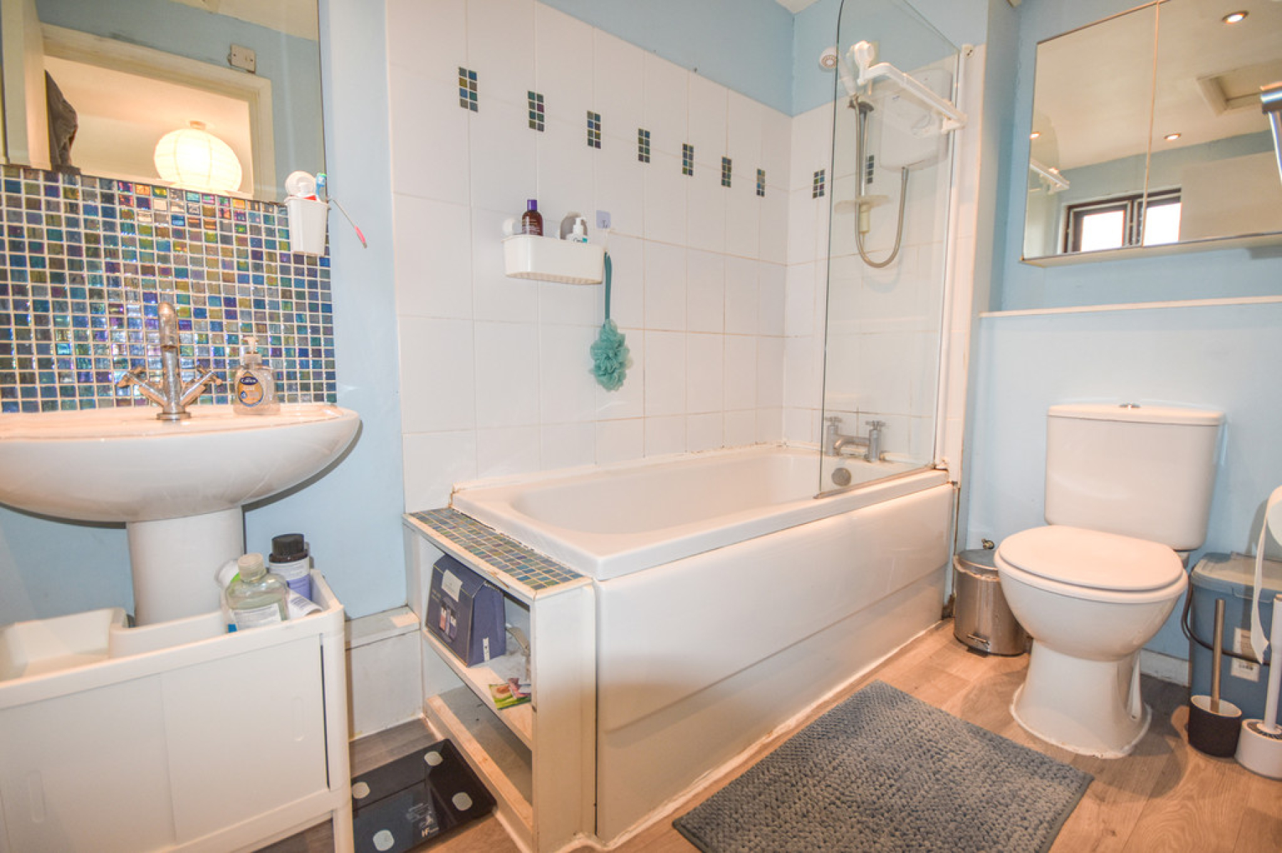 Bathroom11' 1" x 5' 10" (3.40m x 1.80m) With white three piece suite including paneled bath with mixer tap and electric shower over, pedestal wash hand basin and low flush W/C, part tiled walls, wood effect flooring, ceiling spot lights, window to the rear elevation, access to loft storage, extractor fan and fitted storage cupboard.