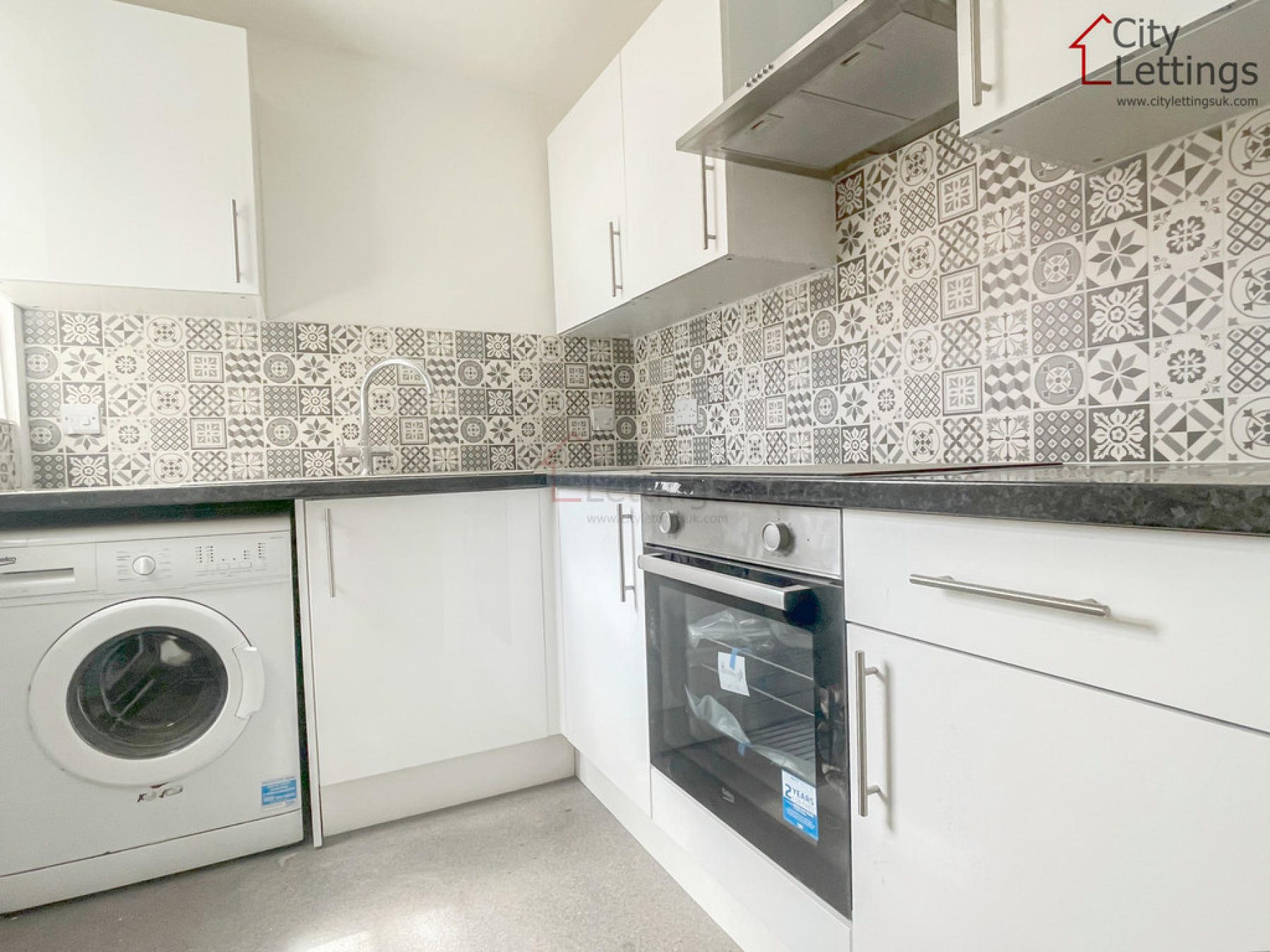Kitchen 7' 4" x 6' 3" (2.25m x 1.92m) With UPVC double glazed window to the side elevation, stone effect flooring, range of wall and base units with roll edge granite effect work surfaces, stainless steel sink and drainer with mixer tap over, plumbing for washing machine, integrated electric oven with four ring electric hob with extractor fan over, tiled splash backs, ceiling light point and door leading out to the rear courtyard garden.